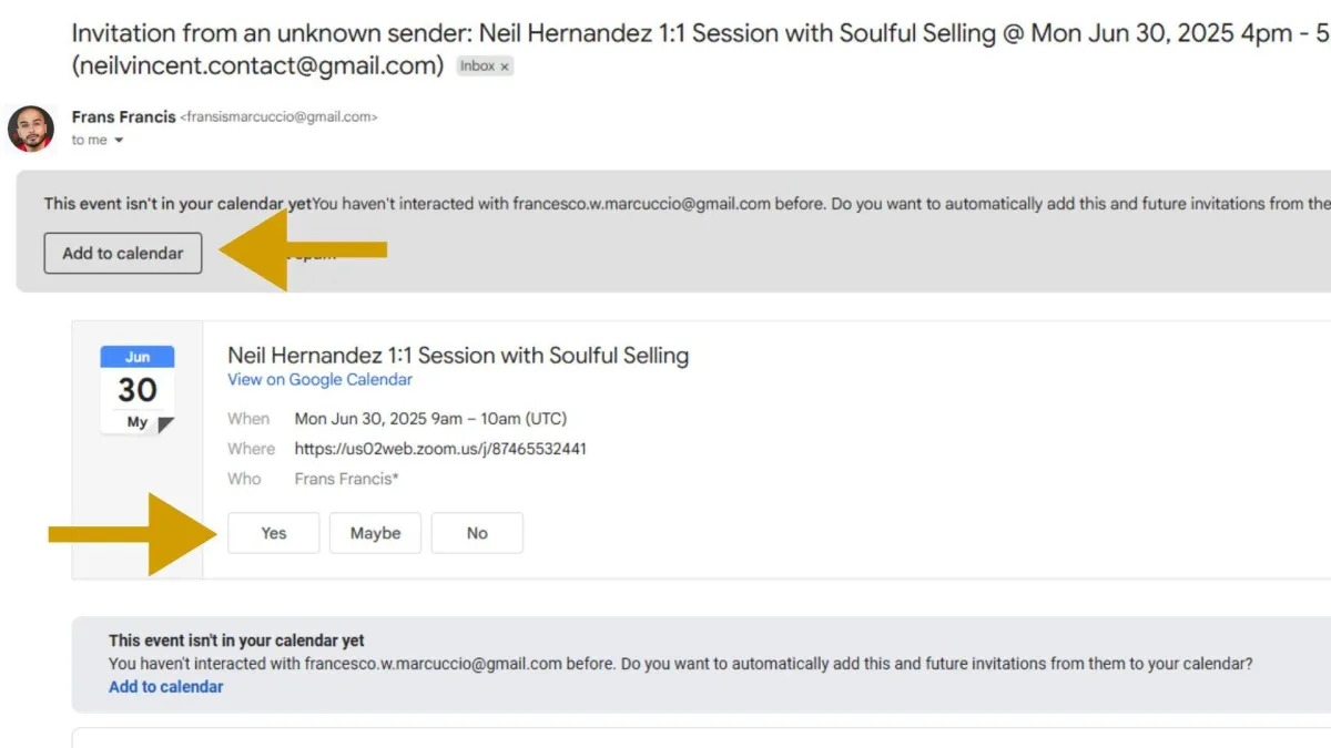 Click "Add to calendar" and "Yes" for the calendar invitation.